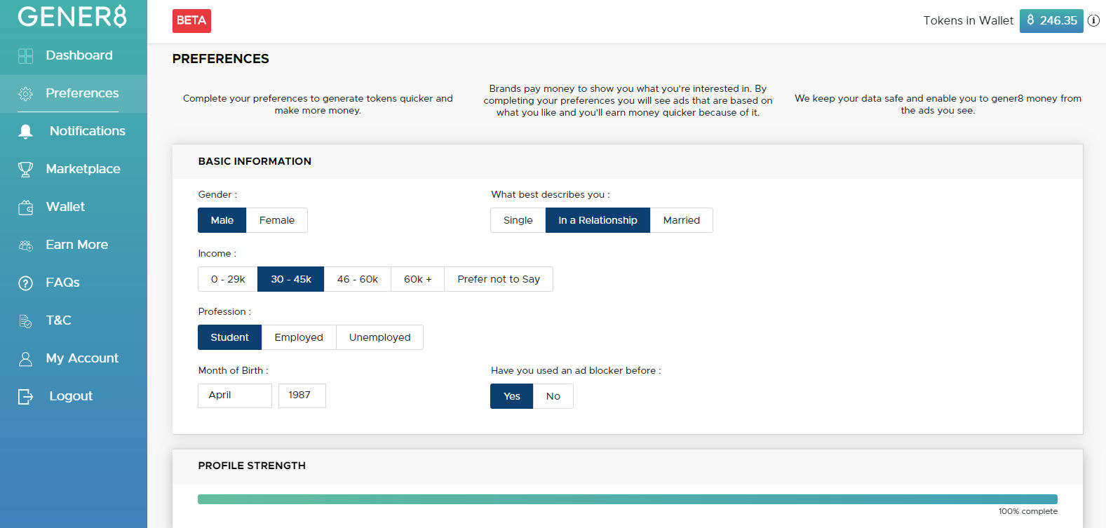 Lyhyesti muotoiltuna Gener8 – sovellus estää mainoksia näkymästä erilaisilla sivustoilla, mutta Gener8 näyttää vastaisuudessaan omia mainoksiaan, jotka ovat räätälöity juuri sinulle nähtäväksi! Kun olet kyseisen mainoksen ”nähnyt” ihan normaalistikkin kuin muutkin mainokset esimerkiksi kilpailevan Googlen. Niin vastaisuudessaan Gener8 maksaa sinulle pientä korvausta tokeneiden muodossa (poletti)!