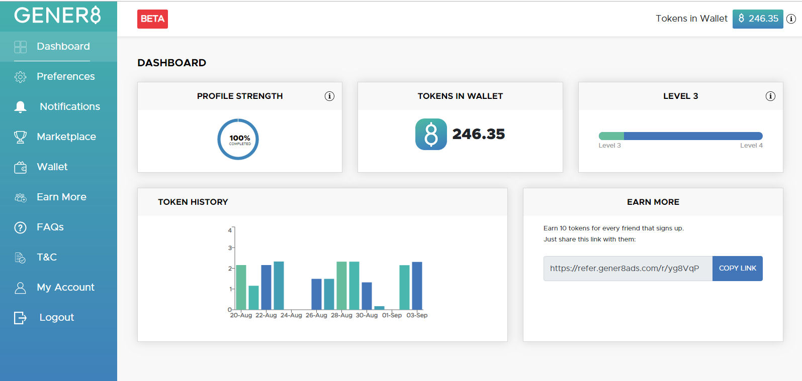 Nämä tokenit välittyvät automaattisesti sinun Gener8 – tilillesi. Näiden tokeneiden toimintaperjaate toimii siis seuraavasti, että kun joku mainostaja ostaa Gener8Ads yritykseltä tietynlaisen mainoksen, niin Gener8Ads vastaisuudessaan palkitsee käyttäjiänsä omalla komissiolla/palkkiolla.
