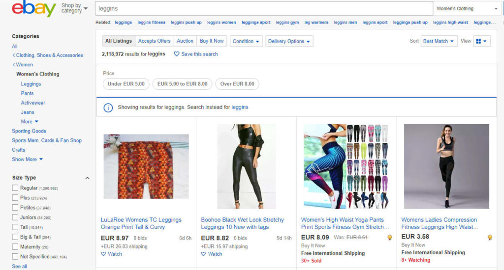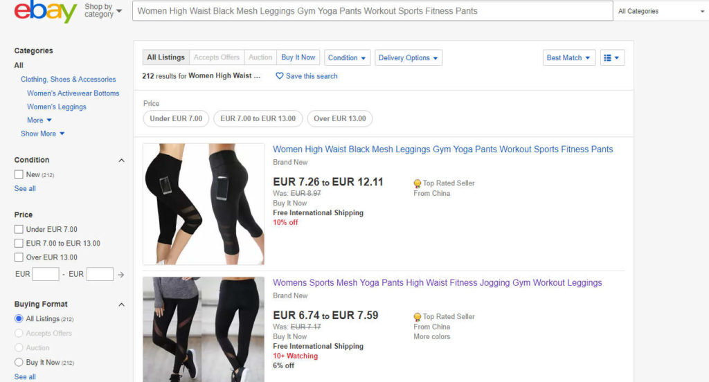 Kun olet nämä Free International Shipping ja Buy it Now toiminnot laittanut päälle! Niin voit jo lähteä etsimään haluamaasi tuotetta Ebayn listaamista tuotteista, jos ja kun löydät haluamasi tuotteen. Sinun pitää sitten lähteä hakemaan siitä se halvin mahdollinen! Me valitsimme tähän esimerkkiin tämän alla olevan leggins tuotteen:
