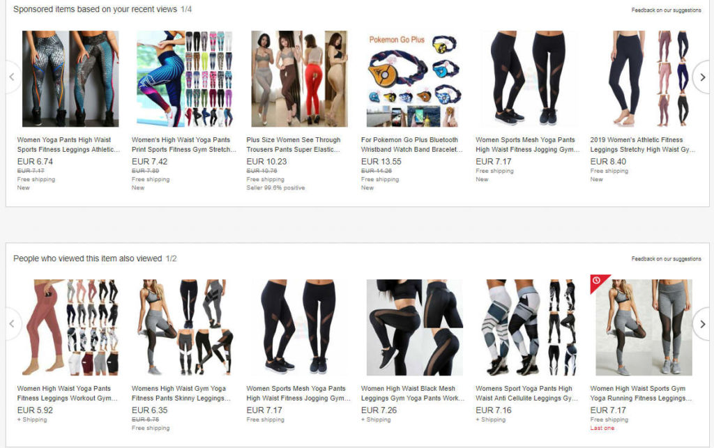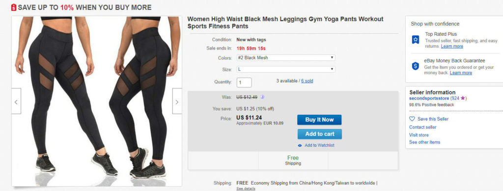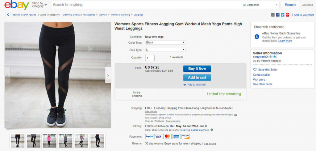 Tässä minun esimerkissä löytämäni ja haluamani tuote oli Women High Waist Black Mesh Leggings Gym Yoga Pants Workout Sports Fitness Pants. Nimeltään todella monimutkainen ja epämääräinen, koska siihen on sisällytetty niin paljon erilaisia hakukone optimointi sanoja, varmaankin koska myyjä on myynti ilmoituksessaan halunnut kävijät löytää hänen tuotteensa noilla kyseisillä hakusanoilla.