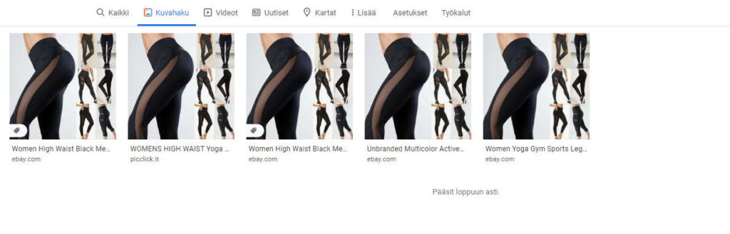 Meidän tapauksessa etsimme siis myynti ilmoituksia, koska tuotteen nimihän oli todella epämääräinen Women High Waist Black Mesh Leggings Gym Yoga Pants Workout Sports Fitness Pants, emme välttämättä tätä hakusanaa käyttäen löydä mitään muuta kuin muita epämääräisiä ilmoituksia Googlessa. Kun kuvat yleensä kertovat tuhat sanaa, niin on viisainta sitten etsiä tuotetta kuvahakuna.