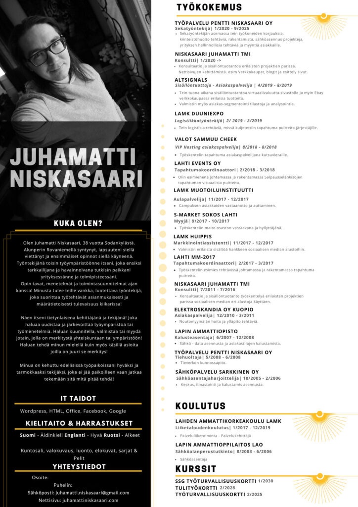 Tältä kyseiseltä sivulta löytyy minun CV – ansioluetteloni, koulutustausta ja työkokemus pääpiirteittäin! Mistä pääset katsomaan työtaustaani ja vähän historiaani!