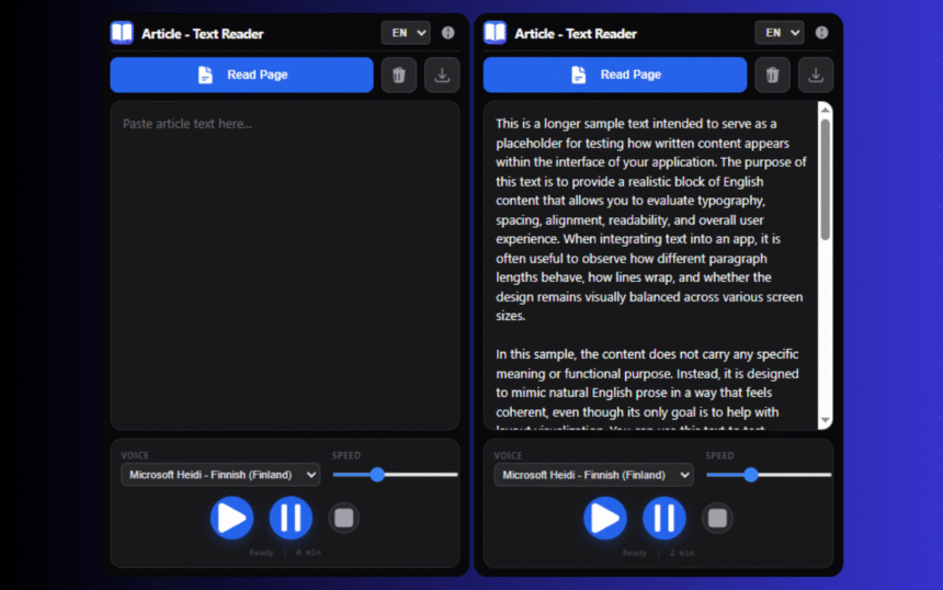 Verkkosisältöä kulutetaan yhä useammin tilanteissa, joissa lukeminen ei ole mahdollista tai tehokasta. Matkalla, työn ohessa tai keskittymisen tueksi tekstin kuunteleminen on monille luonnollinen vaihtoehto. Article – Text Reader on ilmainen…